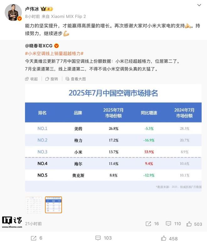 IT之家 8 月 16 日消息,小米集团合伙人、总裁,手机部总裁,小米品牌总经理卢伟冰及小米集团公关部总经理王化在微博转发了上月(7 月)全国空调销售数据,相应数据显示,上月国内空调市场销量前五名分别为美的(26.8%)、格力(17.2%)、小米(13.7%)、海尔(11.6%)、奥克斯(8.8%)。