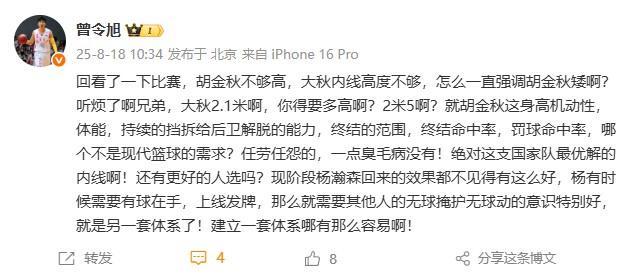 今天,前CBA球员、解说员曾令旭发文,表示对解说员一直强调“胡金秋内线高度不够”很疑惑:“回看了一下比赛,胡金秋不够高,大秋内线高度不够,怎么一直强调胡金秋矮啊?听烦了啊兄弟,大秋2.1米啊,你得要多高啊?2米5啊?就胡金秋这身高机动性,体能,持续的挡拆给后卫解脱的能力,终结的范围,终结命中率,罚球命中率,哪个不是现代篮球的需求?任劳任怨的,一点臭毛病没有!绝对这支国家队最优解的内线啊!还有更好的人选吗?现阶段杨瀚森回来的效果都不见得有这么好,杨有时候需要有球在手,上线发牌,那么就需要其他人的无球掩护无球动的意识特别好,就是另一套体系了!建立一套体系哪有那么容易啊!”
